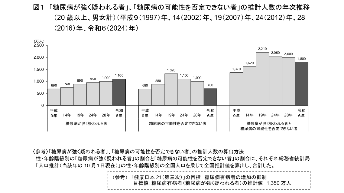 「糖尿病が強く疑われる人」とは、検査でヘモグロビンA1c(HbA1c)の値が6.5%以上であったか、あるいはすでに糖尿病の治療を受けている人を指す。国が掲げる目標(健康日本21・第三次)ではこの人数を2032年までに「1,350万人以内」に抑制することを目指しており、現状の1,100万人はこの目標枠内にはあるものの、1997年の調査では約690万人であり、右肩上がりの勢いが止まっていないことや高齢化が進むことをふまえると、決して楽観視できない。