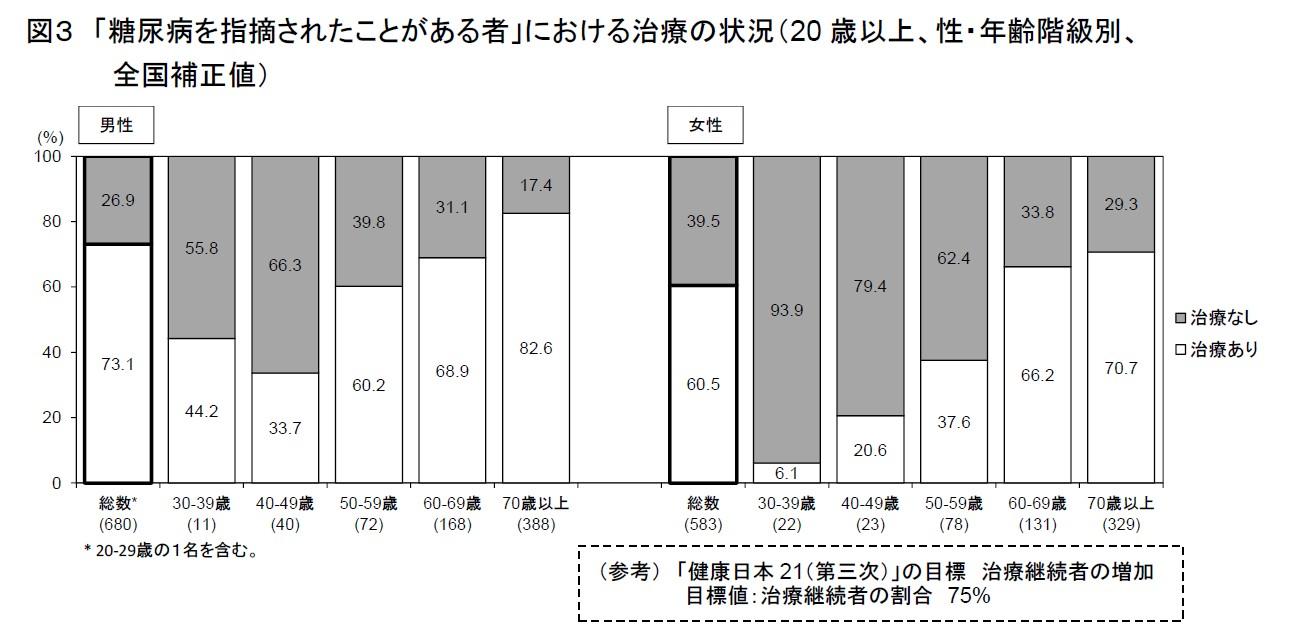 糖尿病対策において現在、大きな課題として浮かび上がっているのが治療状況だ。糖尿病を指摘されたことがある人のうち、現在治療を受けている人の割合は67.4%にとどまっている。