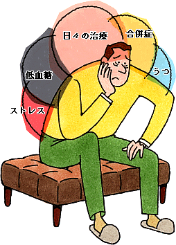 糖尿病の患者さんは、日々の治療(食事療法や運動療法、薬物療法)継続の必要性、低血糖の不安、合併症の症状など、糖尿病でない人にはわからない、さまざまなな心理的な重荷を抱えています。そのために、うつの傾向がみられる患者さんも少なくありません。糖尿病患者さんの2〜3割にうつ傾向がみられる、という統計もあるくらいです。