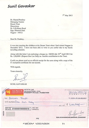 その後、ガヴァスカール氏からドリームトラストへ、寄付金として100万ルピー(約180万円)の小切手が送られました。同封されていた手紙には、『多忙により寄付金の送付が遅くなってしまいましたが、ドリームトラストの活動に役立ててください。』とのメッセージが添えられていました。