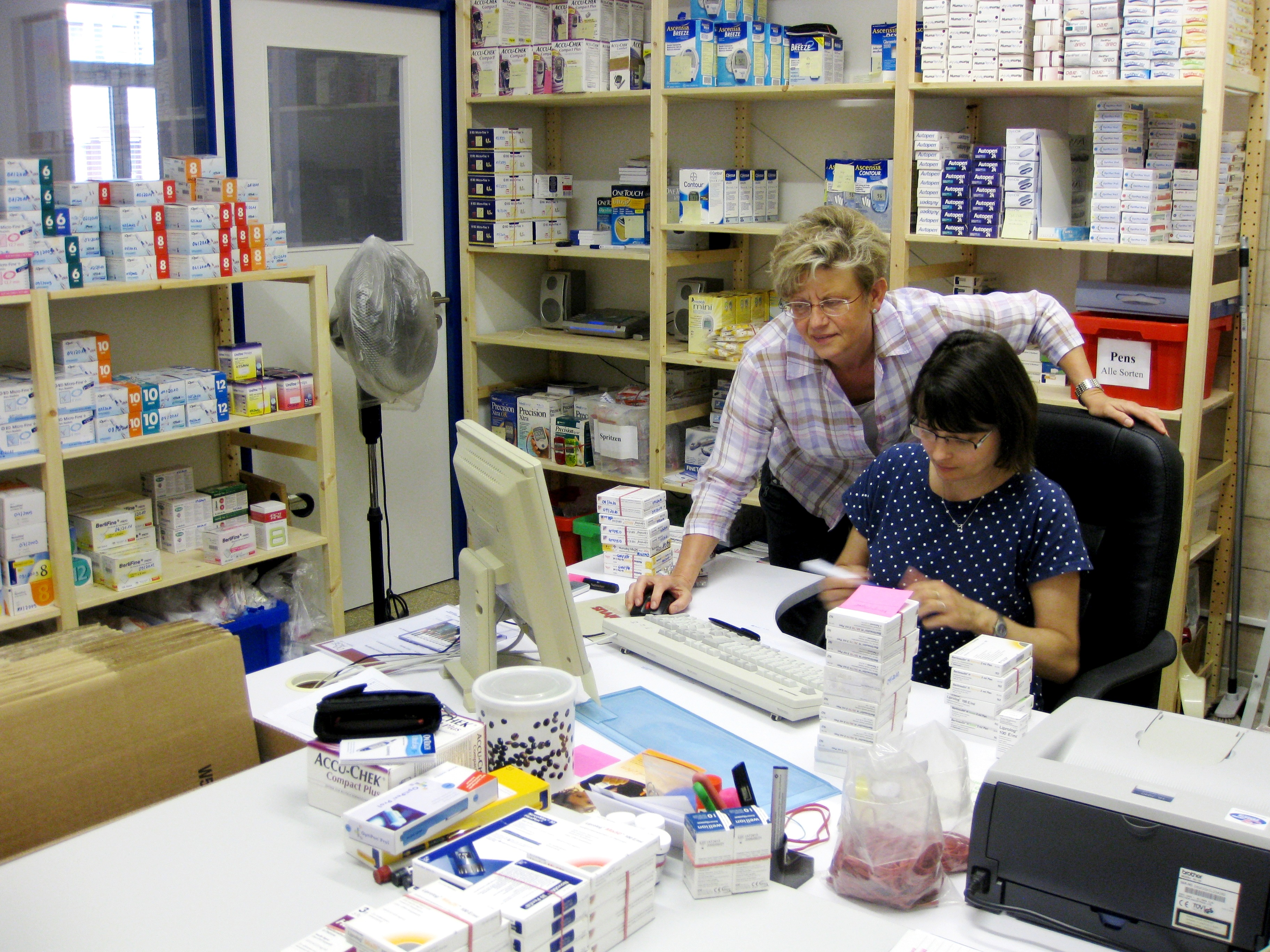 IZLドイツの事務所。棚に収められているインスリン等は、提携先であるルワンダなど途上国の糖尿病患者さんへ寄付されます。