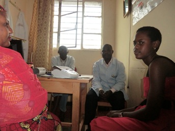 協会の医師(奥右)の診察を受けるジョンジマ・ソニアさん(手前右)、手前左はお母さん