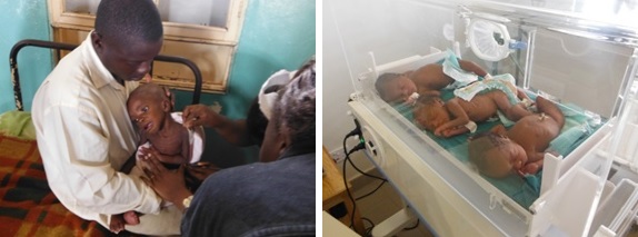 (右)最新の保育器:本来1人1台でなければなりません。アフリカの諸国では、保育器自体が不足しているケースが多々あります。また、私が勤務していた病院では、保育器の台数はあったとしても、設置スペースや電源が不足し全ての保育器を稼働できず、1台に3人押し込めるという苦肉の策で急場を凌いでいました。