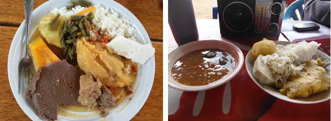 マトケ(甘くないバナナ)、ポショ(トウモロコシ粉を練ったもの)、イモ類、かぼちゃ、米、たまにパスタ を1つの皿に山のように盛ったものが主食です。 それに、大量の油で炒めた玉ねぎとトマトをベースにした塩味スープとロイコ(化学調味料、日本でいう味の素)を入れます。具材は牛肉・ヤギ肉・鶏肉・豆です。また、Gナッツ(ラッカセイ)をすりつぶしてペーストにしたソースを組み合わせる場合もあります。いずれにしても、信じられない位の油の量です。 これに、ソーダを飲み物として添えるのが一般的です。