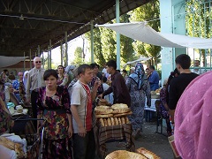 市場には、乳母車で自家製のナン(フランスパンのように固いパン)を運んで売りにくる女性たちでいっぱいです(左の写真)。