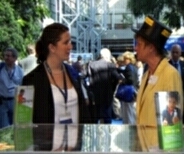 ![]() ブース前でテレビ局の取材を受ける内分泌医でありIFLのボードメンバーのアリシアさん |