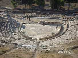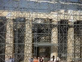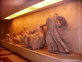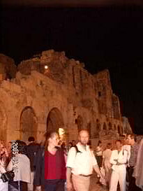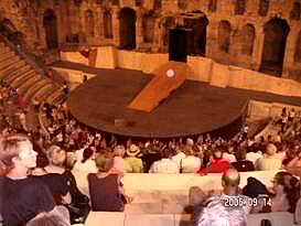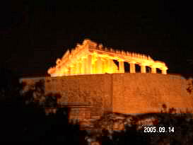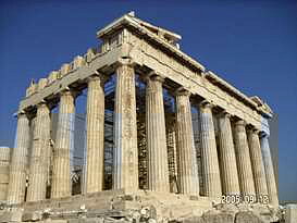 パルテノン神殿 14年前の記憶同様、観光客の靴によりツルツル・ピカピカになった急な石の階段を登っていくとパルテノン神殿の門に着きました。14年前には、階段に大きな犬が3?4匹、堂々と寝こっろがっており、人間様がお犬様を避けて階段を登ったことを思い出しました。しかしながら、階段右手に野外劇場があったことは、思い出せませんでした。 14年前には、門の修理がなされておらず、パルテノン神殿の前まで直ぐに着いた記憶があります。今もなお、修理中のパルテノン神殿。それでも、世界史の教科書に必ず登場するその姿は、荘厳で、美しく、とにかく大きく、昔の人の建築技術に驚かずにいられません。 丘の頂上に位置するパルテノン神殿から見下ろすアテネの街も、ゴミゴミしているものの、遺跡があちこちに点在し、美しいです。 14年前の記憶では、パルテノン神殿は、もう少し白かったような気がするとニールさんに話した所、酸性雨・大気汚染といった公害のために汚れている可能性は大きいと言われました。もし、私の単なる錯覚でなければ、憂うべき事態かもしれません。\\\\n EASDでの仕事を終え、アクロポリスの周辺遺跡もセットになっている入場券を購入していたため、アフター5に再びアクロポリスの麓に戻って他の遺跡を観光しました。この時期、アテネは夜8時ぐらいまで明るいため、遺跡も十分観光できてしまうのです。\\\\n 野外劇場にて アクロポリスに隣接する野外劇場にて、古典ギリシア劇を観劇しました。満月ではないものの、上弦の月の中、古代劇場で古典劇を見るのは、初めてなので、とても興奮しました。英語の字幕は出るものの、字幕を見てしまうと劇そのものの動きが見えなくなってしまうため、どちらに重点を置くかで迷いましたが、結局、劇の動きを優先しました。英語のネイティブスピーカーであるニールさんでさえ、両立は難しかったそうです。特に影絵のようなかたちで、白い布の後ろから光をあて、人が機織、鍛冶といった昔からの仕事を再現している状態は非常に美しく、良く、壷や壁画に描かれている絵そのものでした。 上演中にフラッシュ撮影が禁じられており、この美しい影絵を含めて、劇の内容を写真に収められなかったのが残念でなりません。 アテネ滞在中の夕飯は、ファーストフードばかりでなく、タベルナと言われるギリシアスタイルレストランで、IFLスタッフ達とともにした日もありました。「タベルナ」というと日本語で「食べるな」と同じ響きなので、何か妙な感じがします。他のスタッフ達に説明したら笑われました。