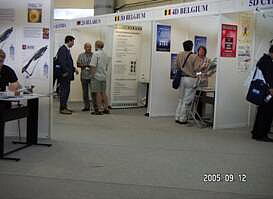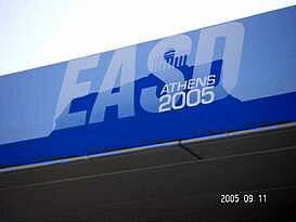 地下鉄で7駅ほど先の駅から徒歩6?7分ほどの会場へ、まずはブースの設営のために行きました。駅は、アテネオリンピックが開かれたオリンピックスタジアムの近くにあります。駅の通路には、「2005 EASD」と書かれたポスターが貼られ、「2005 EASD」と書かれたバッグを持った大勢の人たちがおり、皆、会場へ向かって歩いていました。