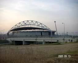 スタートから少々遅れた状態で歩き始めため、1km地点で、すでにランニング参加者のトップグループが折り返して道の反対側を走っている状態でした。オリンピックスタジアムを横目に見ながら、「野口みずき選手もここを走っていたのだなぁ?」などと思いながら、マイペースでトロトロと歩き、しかも途中で写真を撮りながら歩いていたため、どんどん前を行く参加者達から引き離されてしまい、断トツのビリの状態でした。