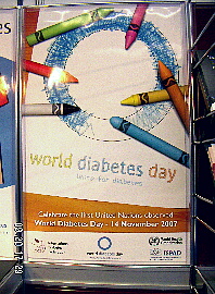 昨年12月に国連が、糖尿病を罹病期間が長期にわたる慢性病で、さまざまな派生的な影響を生じ、コストがかかり、患者や家族だけでなく、国家、地球全体に影響を及ぼす疾患として認め、抜本的な対策を立てていかなければならないという決議を採択しました。世界糖尿病デーは今年から国連が執り行います。会場でも世界糖尿病デーの展示が目立っていました。