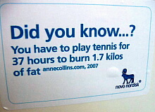 ノボ社の展示より。「ご存知ですか? 1.7キログラムの脂肪を燃やすためにテニスを37時間もしなければなりません」と書いてあります。