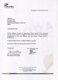 南米エクアドルで小児糖尿病患者さんを支援する活動をしているFUVIDA(Fundacion aprendendo Vivir con Diabetes)は、1型糖尿病患者さんを対象にサマーキャンプを開催するなど、さまざまな活動を行っています。 国際糖尿病支援基金は、この活動の趣旨に賛同し、インスリン・フォー・ライフ(IFL)(オーストラリア)を通じてFUVIDAを支援しています。 2012年7月25日から29日にかけて開催される糖尿病のサマーキャンプ「Dulces Amigos 2012」へのご支援をお願いしましたところ、多くの方から関心をお寄せいただき、ご寄付をいただきました事を心より御礼申し上げます。 ■2012年エクアドルのFUVIDA糖尿病サマーキャンプへのご支援をお願いしますhttps://dm-net.co.jp/idaf/2012/016951.php この度、FUVIDA代表のアラセリー・バスルト・カルデロン医師より、国際糖尿病支援基金からの支援に対してのお礼状が届きましたので、ご紹介します。