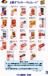 そして、間食、おやつは、この信号機には入っていません。あくまで“おまけ”です。何を食べてもいいし、おやつを食べてはいけないわけではないけれど、食べる時間や量を加減するようにと申し上げます。本来は、指示エネルギー量の範囲内に、間食も納めるべきということになっていますが、なかなかできない方が多い。ですから、患者さんには“おまけ”なので、食べ過ぎたらダメなんですよ、という危機感を持ちながら摂ってもらう。そうですね、指示エネルギー量の1割以内位なら許せる範囲でしょうか。食べるなとは言わないけど、それ以上は摂らないように、としています。そして、おやつにはいろいろな種類、内容があるので、選び方、調理のしかた、味付けのしかたなど、工夫できることはやってみましょう、という提案や、おやつのカロリーについて、資料を使い、なるべく具体的に情報提供して、患者さん自身でチェックしながら食べていただくようにします。