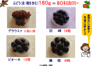 西村:私は、神戸を拠点に、山梨や埼玉などで指導を行っていますが、山梨の辺りでは、ぶどうがよく採れるので、地元の方は、手に入りやすいのもあってよく食べているんです。果物屋さんへ行くと、ぶどうでも最近ではいろいろな品種があって、種なしだったり甘みが豊富なものだったり。美味しくて食べやすいと、ついつい1房食べてしまうこともあると思うんですね。ですから、この辺の患者さん用にと、ぶどうのカロリー表を作って、季節が来ると指導に使っています。例えば、小粒のデラウェアでは小さい1房と1/3房で80kcal分ですが、地元のピオーネだと12粒、藤稔という品種では8粒。