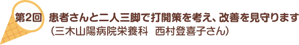 第2回目は、神戸の病院で糖尿病患者さんの食事指導に従事している西村登喜子さんに、間食の指導法についてうかがいました。病院勤務の管理栄養士として30年以上の経験で培われたコツをご伝授いただきます。