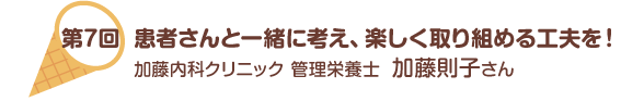 第7回目は、加藤内科クリニックの加藤則子さんを訪ねました。国内外の学会や講演会を飛び回り、最新情報を常に取り入れている同院の療養指導には定評があります。幅広い知識と好奇心旺盛な取り組みを活かした間食指導について、同院・管理栄養士の齋藤杏子さんも加え、たっぷりお話をお伺いしました。(今回は前編・後編の2部構成です!)
