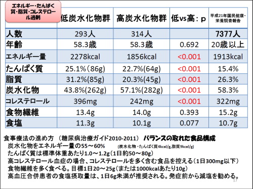 当院で、栄養指導を受けた患者さん607名の「エネルギーの栄養素別構成比」を見てみました。平均年齢58.5歳で、1日の摂取エネルギーの平均は2060kcalです。すると、炭水化物の比率は平均51%と少ないことがわかりました。これに対し、脂質は25%、たんぱく質は24%と、そのぶん高くなります。そこで、高炭水化物群と低炭水化物群に分けて分析してみました。やはり低い群は、おかずが多くなるということなので、総摂取エネルギー量はじめ、たんぱく質や脂質が総じて高くなります。これを見ると、むしろご飯をきちんと食べて、おかずの内容を考えた方が糖尿病の治療という意味では有効と言えるのかもしれません。もし低炭水化物食にするならば、より一層、飽和脂肪酸や塩分を減らし、食物繊維をしっかり摂らなくてはいけません。また食費も高くなりがちであることも知っておく必要があります。