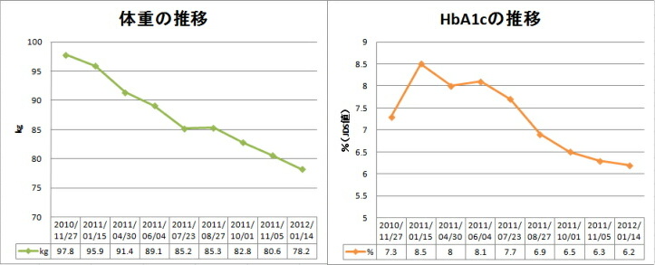 2010年当初の治療はSU薬(グリメピリド)+ビグアナイド(メトホルミン)+チアゾリジン(ピオグリタゾン)でした。血糖値は下がりましたが体重が増加してしまったため、ピオグリタゾンを中止。その結果、体重は減ったのですが、血糖コントロールは再度悪化してしまいました。2011年3月にDPP-4阻害薬(シタグリプチン)を加え、体重も減少しましたが、まだ血糖コントロールは不十分でした。患者さんと医師は話し合い、2011年7月GLP-1受容体作動薬であるエキセナチドとSU薬併用に挑戦しました。
