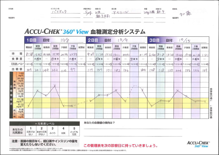 次に、3日間の連続血糖測定(後述の「ACCU-CHEK 360°Viewシート」)を勧めたところ、食事量をさらに減らすようになりました。間食は次の食事の血糖値を上げてしまうこと、食後の運動が血糖値を下げることも実感できたようです。