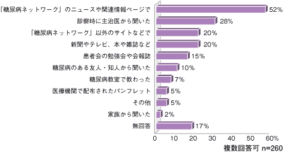 インスリンポンプ療法の関連情報を随時配信していることもあり、「糖尿病ネットワークで情報を得た」と回答した方が約半数と最も多い結果でした。また、「主治医から」は28%、「糖尿病教室で」は7%、「医療機関で配布されたパンフレット等」が5%と、通院する医療機関で情報を得ている患者さんは少ないようです。