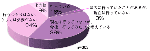 「現在、行っている」「過去に行っていた」方を合わせて、経験者は19%でした。また、「現在は行っていないが、今後、行ってみたいと考えている」と、興味を持っておられる方が約4割いらっしゃいました。