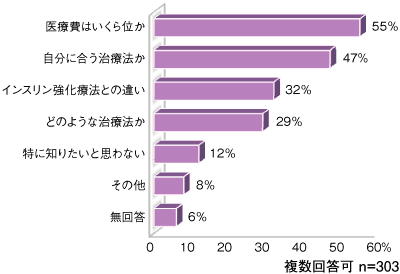 “知りたいこと”としては、「医療費」についてが最も多かったものの、「自分に合う治療法か」「インスリン強化療法との違い」「どのような治療法か」といった、情報を求める声も根強くみられました。