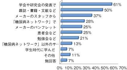 「学会や研究会の発表で」が最も多く6割、「雑誌・書籍・文献などから」が半数でした。その他では、医師の3割や看護師(全員CDE)の4人に1人が、「メーカー、代理店のスタッフから」「メーカーのパンフレットから」と回答。さらに、看護師さんは「糖尿病ネットワークから」「勉強会など、同僚から教えてもらった」という方も多くみられ、様々な方法で情報を得ているようです。