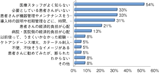 導入していない方の半数強が、インスリンポンプ療法について「医療スタッフがよく知らない」との回答でした。また、「導入時の説明や初期管理などに、時間、人材、労力をかけられない」が3割と、医療機関側の体制がなかなか整わない現状が伺えます。