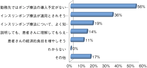 お勤めの病院・医院で“導入されていない”理由として最も多かったのは、「インスリンポンプ療法について医療スタッフがよく知らない」で、約6割でした。また、「時間、人材、労力をかけられない」といった体制の問題がハードルになっている所が4割程ありました。