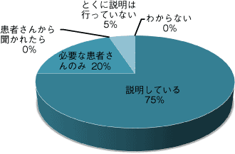 「必要な患者さん」(20%)はもちろん、75%が「説明している」としており、インスリンポンプ取扱い医療機関では、インスリン治療の選択肢の1つとして情報提供が行われているようです。