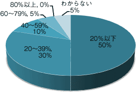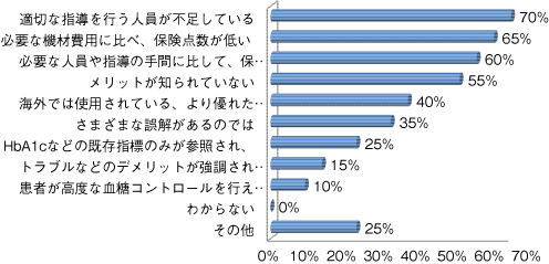 インスリンポンプ療法は、患者さん自身による操作・管理等が可能であり、その機能を最大限に活用することで、より生理的なインスリン分泌を実現できるため、血糖コントロールに対する意識が高い患者さんに適していると考えられています。そういう意味で、適応が難しい患者さんは「20%以下」いるとする方が半数、「20〜39%位」が3割といった状況のようです。