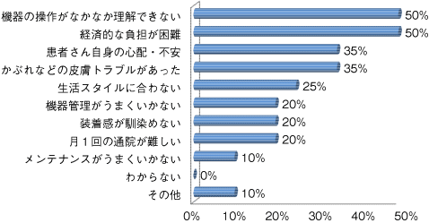「機器の操作がなかなか理解できない」、「経済的な負担が困難」が半数、「患者さん自身の心配・不安」、「皮膚トラブル」が35%ということでした。