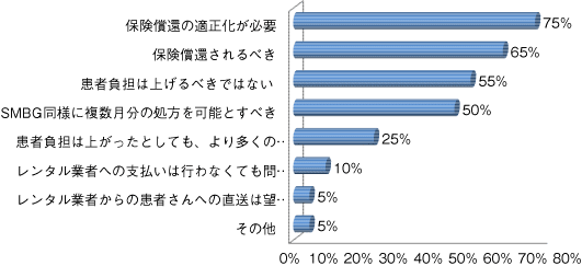「保険償還の適正化が必要」が75%、「ポンプの消耗品は出来高払いにて保険償還されるべき」が65%とする一方で、「患者負担は上げるべきではない」が55%、「ポンプの消耗品も、SMBG同様に複数月分の処方を可能とすべき」が50%といった回答でした。