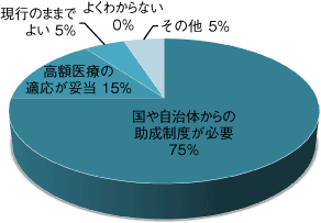 「国や自治体からの助成制度が必要」と考える医師は75%、年間医療費として捉えると「高額医療の適応が妥当」とする方は15%と、回答された9割の医師が、1型糖尿病患者さんに対する助成の必要性を感じておられるようです。