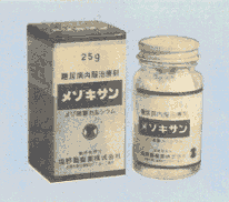 1951年より東北大(黒川利雄)、国立東京第一病院(坂口康蔵)、東京大(葛谷信貞)、慶応大(山口与一)、神戸医大(竹田正次)の5施設で臨床治験が行われた。東北大黒川内科では筆者らが20例に使用し尿糖排泄量の減少などを認めたが著効例はなかった。また対照9例について食事療法だけで15〜30日経過観察し尿糖量が50%以上減少することを認めた(治療37巻8号)。5施設の成績をもとに1953年文部省研究班「糖尿病の化学療法」(班長東京大薬学近藤平三郎)が結成された。製品化に当たって引用された症例数は大阪大吉田内科61例、国立東一61例、東京大沖中内科28、田坂内科15、上田内科2、東北大黒川内科27、神戸医大竹田内科16、東京女子医大15、加古川病院10、京府医大7、名大山田内科4、沼津市立4、九大児玉ら3、日生病院3、和歌山医大1の計257例で、1955年より塩野義製薬 KK よりメゾキサンとして市販された( 図4)。