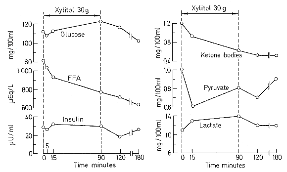 キシリトールの点滴によって血糖の上昇は認められないが、血漿FFAは低下する。これはキシリトールがエネルギーとして利用されていることを示唆する現象である。