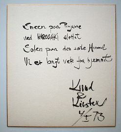 デンマークのAarhus大学のLundbaek教授は羅病期間15〜25年間の234症例を分析し1953年にLong-Term Diabetesとして出版した。当時は慢性合併症への関心も少なく、この著書は非常に注目された。私は本シリーズ No.20 にあるように早期糖尿病の国際シンポジウムに招かれて地中海の太陽海岸マルベラの会議で発表したが、その帰途、AarhusにLundbaek教授を訪ねた。ちょうど日本の昔の版画展が開かれていて歓迎された。それから4年後の1972年12月に京都の正月を見に行くので弘前にも寄りたいと手紙をもらった。当時、単身赴任で正月は仙台の自宅で過ごしていたので1月4日に来るように京都からの交通手段などを報せてやった。教授は予定通り弘前に着いた。1月の弘前は雪である。夜は料亭中三で教授を囲み青森市の渡辺欽也先生、平井一郎先生らとともに歓談した。教授は日本文化への関心も強く、色紙にみんなで絵を描いて楽しんだ。かたつむり、そろそろ登る富士の山、なども描いた。教授は昼に見た雪の弘前城の詩を書いた(図6)。翌日は正月休みも終わったので、教授とともに病棟回診を行った(図7)。