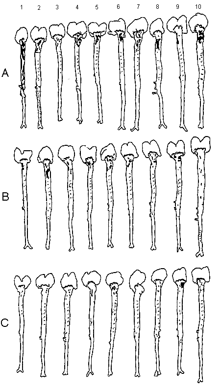 図8 高脂肪食飼育家兎の大動脈アテローム ![]() A:水道水群 B:5%エタノール水群 C:10%エタノール水群 |