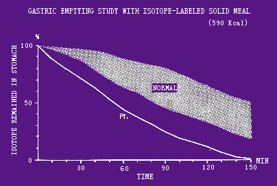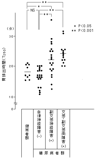 胃は摂取した食物を保留し、蛋白質などの消化を行いながら、十二指腸に排出する。この排出図3の斜線の部分が非糖尿病者の排出能であり、白丸が自律神経障害のある人達の平均、黒丸は自律神経障害のない人達の平均である。自律神経障害のない人ではむしろ胃排