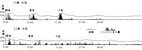 人工膵臓は血糖値を測定しながらグルコースを点滴したりインスリンを点滴する装置である。この装置(Biostator)で血糖値を80〜100mg/dLに維持させると、食事をとって血糖が上昇するとその上昇を抑制するためにインスリンが注入される。したがって注入されるインスリン量の推移をみれば胃からの食物排出を間接的に知ることができるわけである。この方法で胃排出の状態をみたのが図7である。図の上の37歳女性では朝食、昼食、夕食をとると、それに対応してインスリンが注入され食後2時間位するとインスリンの注入はみられない。これは胃から食物がまとまって排出され血糖が上昇しようとしたことを示している。図の下の21歳の女性の場合には朝食、昼食、夕食をとっているのに上の例のようにまとまったインスリンの注入がみられず、1日にわたってインスリンがじわじわ注入されているのがみられる。この方の場合は胃から少しずつ十二指腸に排出され、血糖が上昇しようとしてじわじわとインスリンの注入を招いているのである。このパターンは胃の排出このように人工膵を用いて胃の排出機能を知ることができるので、排出