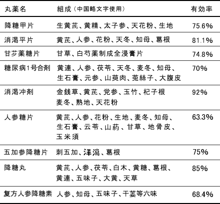 わが国の漢法は現在中国で用いられているものとは異なっている。中国の病院の薬局には300種類ほどの薬が1つずつ棚に並べられている。ムカデといえば12、3cmの乾燥したムカデが100匹以上も引き出しの中に収まっており、薬石というように鉱石もある。わが国では東洋というと中国やインドまで包含する言葉のように思われるが、中国では日本のことを東洋と呼んでいたのである。したがって東洋医学という言葉もそのことを理解して使うべきである。さて、中国で現在糖尿病治療に用いられている薬剤は趙志剛、張春玲によれば次のようなものがある。