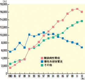糖尿病性腎症が進行し腎不全に至ると、透析療法の必要が出てきます。現在、国内で毎年1万数千人が糖尿病性腎症から透析療法を開始していて、この数は透析療法を始める原因のトップです。
