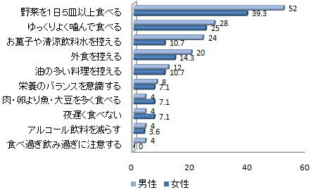 下の図4をご覧になっていただきたいのですが、食事指導をした際に院内でアンケートを行いました。男女別で「食生活改善ができなかった項目」として調べたのですが、どんな項目が一番やりにくかった、改善しにくかったか、が浮かび上がりました。最も高かったのは、“野菜を1日5皿以上食べる”“ゆっくりよく噛んで食べる”に続いて“お菓子や清涼飲料水を控える”という順番だったのです。お菓子は、野菜摂取よりも改善しやすい。だから、今までお菓子を食べていた人も目標達成のためなら、決して改善できないわけはないと思うのです。