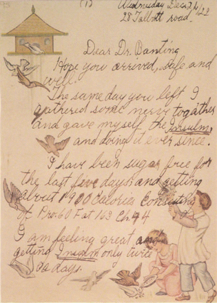 一通の手紙とは1922年12月21日、8歳の少女がインスリンの発見者バンチングに宛てて書いたものである。鳥の飛んでいる見事な自作の絵の上に“バンチング先生にお会いしてインスリン注射をする勇気がわき、1日2回の自己注射を始め、此の5日間は砂糖なしの1900キロカロリーの食事をとり、とても気分が良くなりました”という主旨のお礼と報告を兼ねて書かれた手紙である。